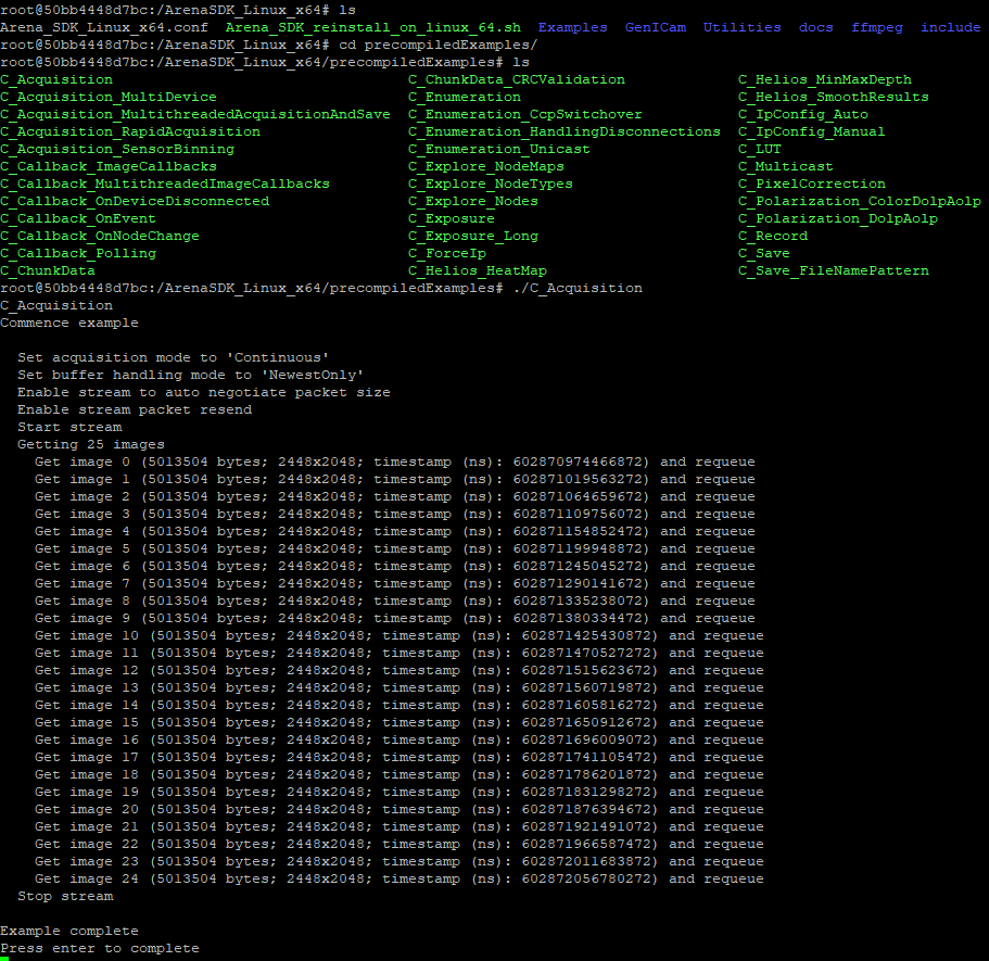 Head to the compiled examples folder in ArenaSDK_Linux_x64 and run Cpp_Acquisition.cpp
