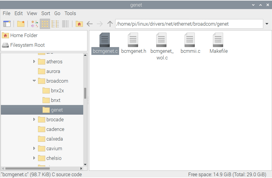 In File Manager, navigate to the directory /home/pi/linux/drivers/net/ethernet/broadcom/genet and open the file bcmgenet.c. If Option 2 was used earlier, the directory will be /home/pi/linux-raspberrypi-kernel_1.20210108-1/drivers/net/ethernet/broadcom/genet/.