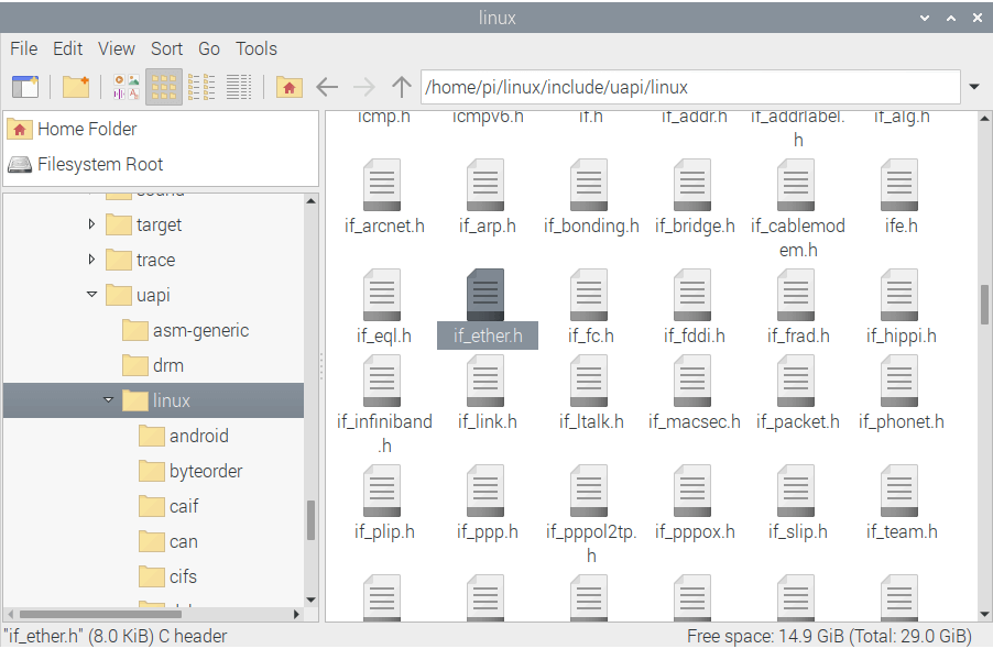 In File Manager, navigate to the directory /home/pi/linux/include/uapi/linux and open the file if_ether.h. If Option 2 was used earlier, the directory will be /home/pi/linux-raspberrypi-kernel_1.20210108-1/include/uapi/linux/.