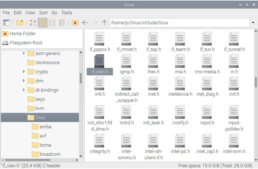 In File Manager, navigate to the directory /home/pi/linux/include/linux and open the file if_vlan.h. If Option 2 was used above, the directory will be /home/pi/linux-raspberrypi-kernel_1.20210108-1/include/linux.