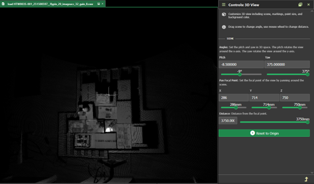 Example file opened in ArenaView MP. To obtain the view above, ensure that the settings Controls > Image Processing > Time-of-Flight Processing > Channel Selection is set to Intensity.
