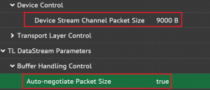 To ensure the packet size is set to 9000 Bytes, make sure Stream Auto Negotiate Packet Size is set to true and check Device Stream Channel Packet Size is 9000 B when streaming.