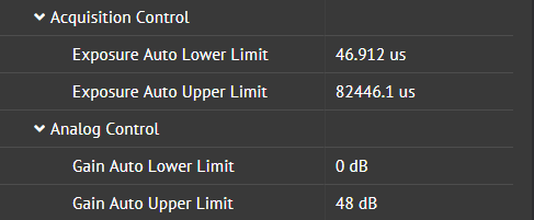 Users can set Exposure Auto Lower Limit/Exposure Auto Upper Limit and Gain Auto Lower Limit/Gain Auto Upper Limit.
