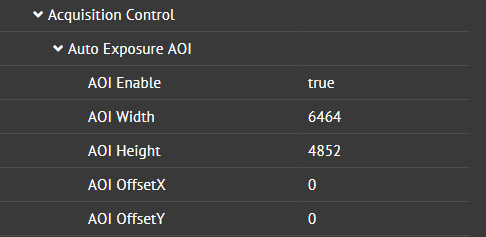 AOI OffsetX and AOI OffsetY can be adjusted after reducing your image’s ROI. If the Auto Exposure AOI is not reduced and at its maximum value, there is no room for offset to be adjusted. The offset’s start point is at the origin of the image.