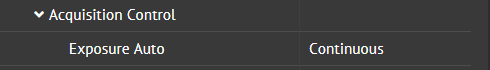 Users can set the auto exposure algorithm to be evaluated on a specific region of the image by using the Auto Exposure AOI features. To use Auto Exposure AOI, set Exposure Auto to Continuous: