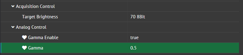 To achieve a more qualitative image for uncontrolled outdoor environments, setting the target brightness and gamma nodes to the following values has shown to produce the best results: