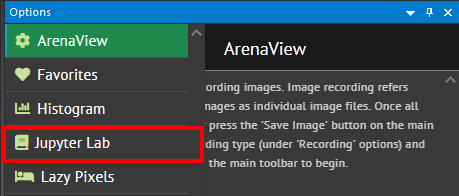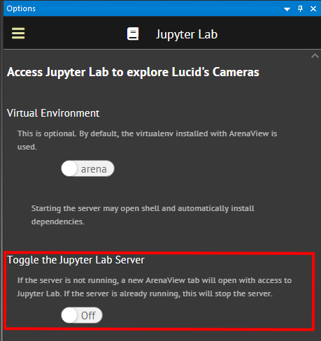 In the Jupyter Lab options tab, turn on the Jupyer Lab server. If this is your first time installing Jupyter Lab, ArenaView will download and install the required dependencies.