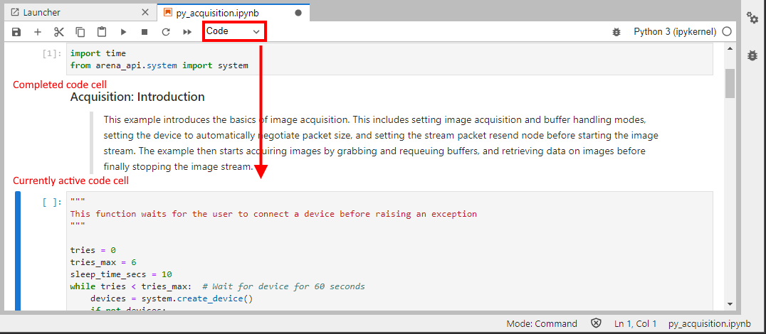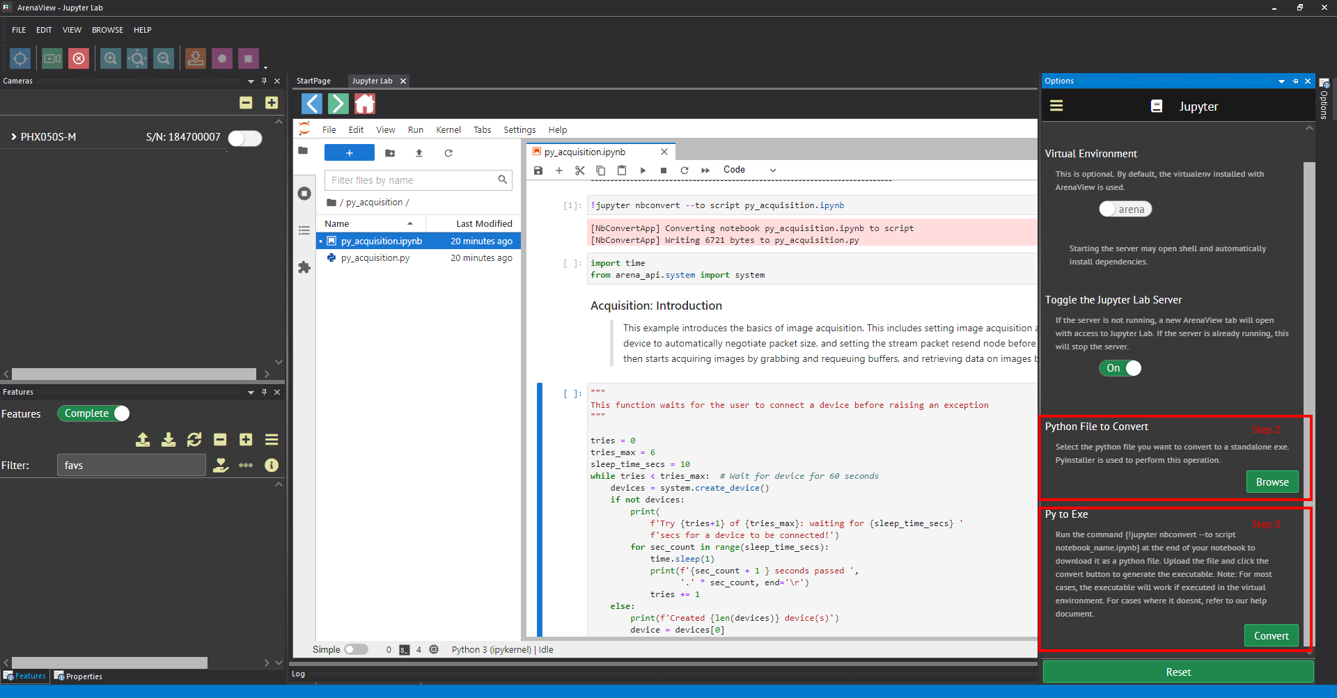 JupyterLab on ArenaView enables application designers to quickly test and validate all camera features and speed up their product qualification workflow without having to setup a custom development environment. JupyterLab provides a built-in and preconfigured interactive development environment that can be used for testing and documenting all SDK functions and camera performances. It is installed with Arena SDK using the Developer installation option. The following instructions explains how to launch and use JupyterLab within ArenaView.