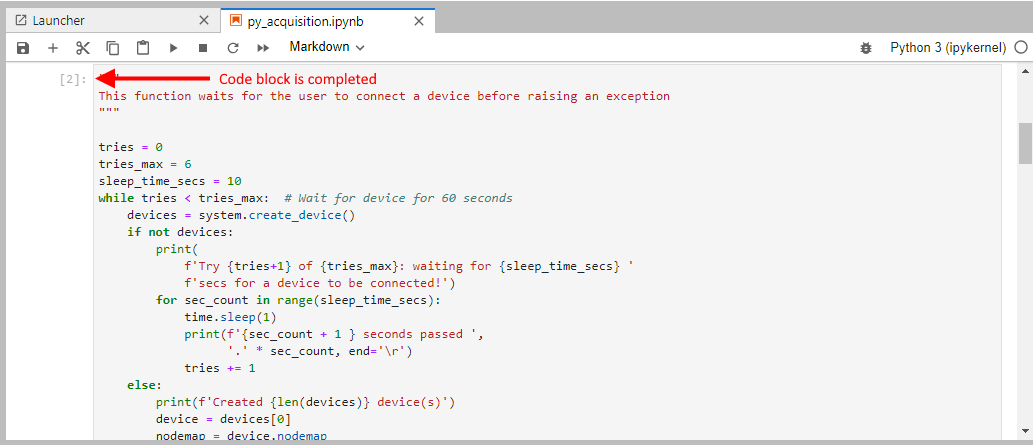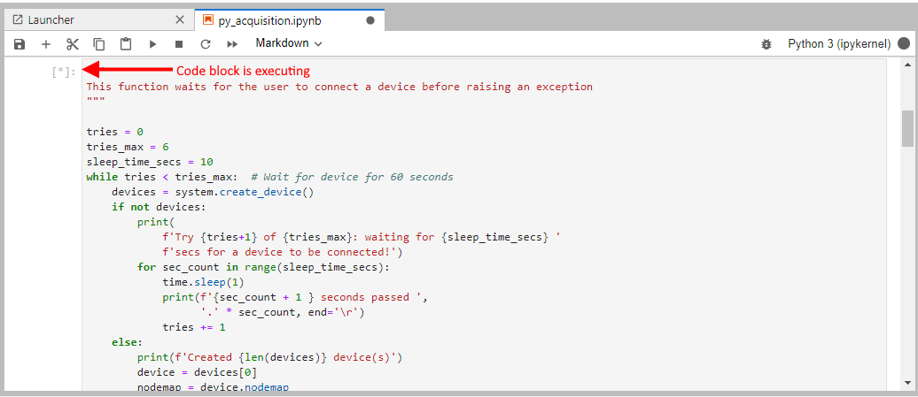 - Press the ▶ button to execute a code cell. The code cell will display an asterisk (*) beside the cell while it is being executed, and it will show a number upon completion.