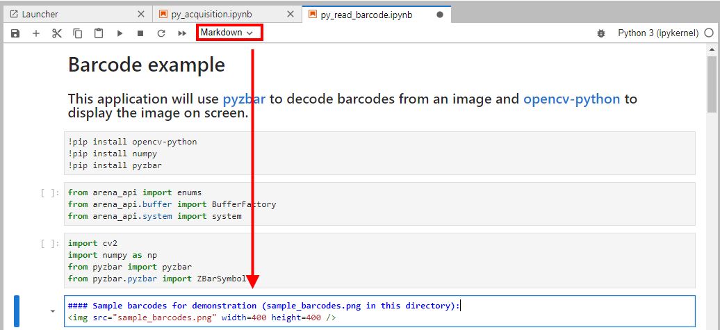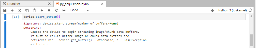!pip install opencv-python [...] import cv2 [...] image_buffer = device.get_buffer() nparray = np.ctypeslib.as_array(image_buffer.pdata,shape=(image_buffer.height, image_buffer.width, int(image_buffer.bits_per_pixel / 8))).reshape(image_buffer.height, image_buffer.width, int(image_buffer.bits_per_pixel / 8))
