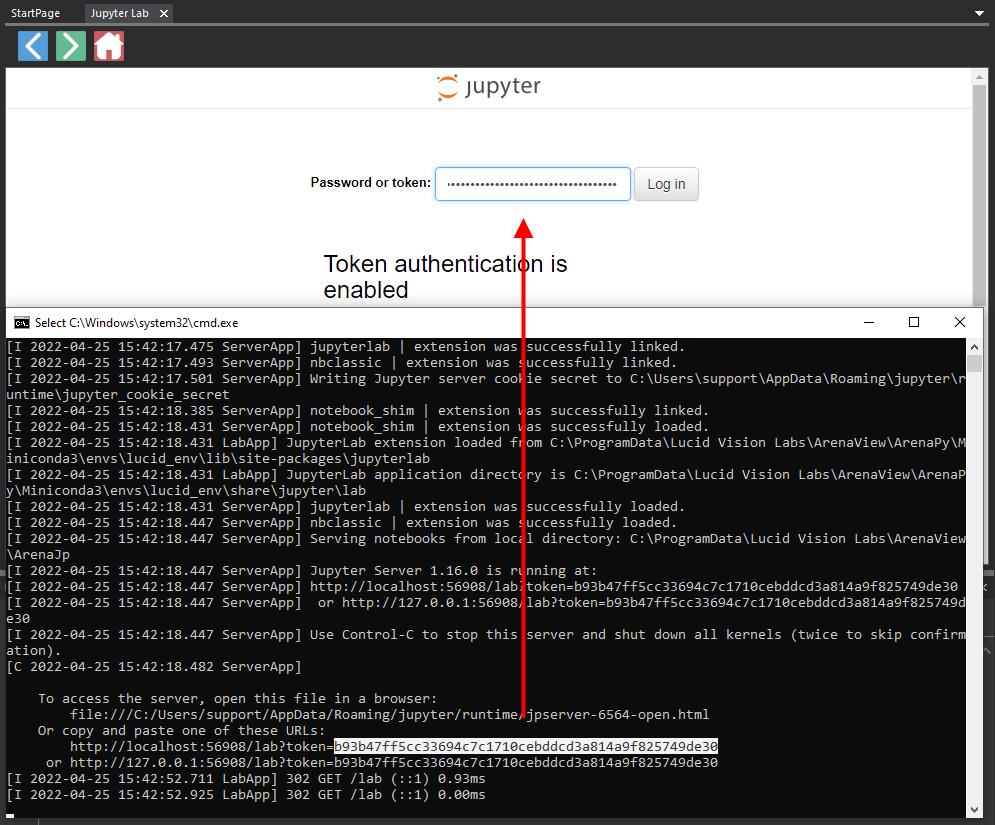 If this is your first time installing JupyterLab, you will also be asked for a token to access the JuptyerLab server. This token is presented after ArenaView installs the JupyterLab dependencies. Enter the token into the “Password or token” field and press Log in. You can also assign a server password instead of using a token.