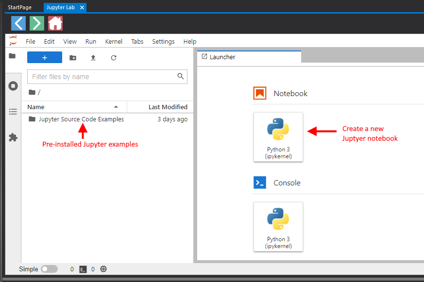 After starting the JupyterLab server, you will be presented with the Jupyer launch page. From this page, you can start your own Jupyter notebook or browse the preinstalled examples that come with the Arena SDK installation.