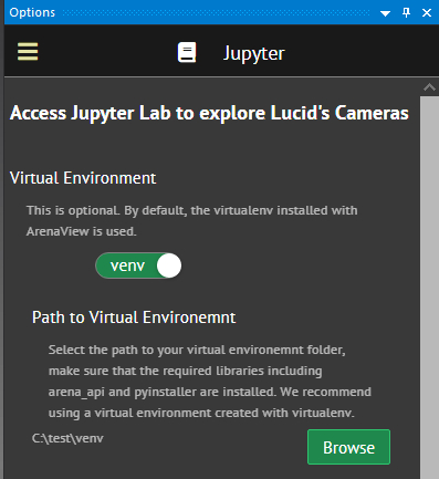 Custom virtual environments must install the JupyterLab requirements in the jupyter_requirements_win.txt file found at C:\ProgramData\LUCID Vision Labs\ArenaView\ArenaPy: