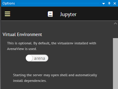 It is possible to define the virtual environment used by ArenaView in the JupyerLab Options tab. Set the virtual environment slider to arena to use the preinstalled virtual environment: