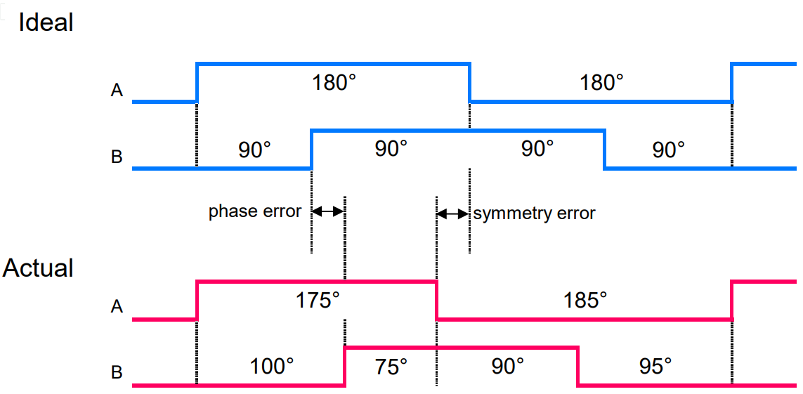 EncoderMode sets whether the decoder uses FourPhase mode with jitter filtering or the HighResolution mode without jitter filtering. Jitter includes phase error and symmetry error as shown in the diagram below.